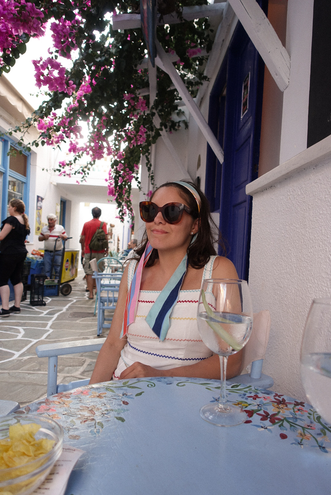 The views were amazing, the streets narrow and winding, the people mostly other Greeks on holiday. All the classic Cycladic architecture you would expect to find like stone washed square homes, cascading bougainvillea, pastel accented doors, tiny churches and many little quint cafés to sit at and relax all afternoon.Â