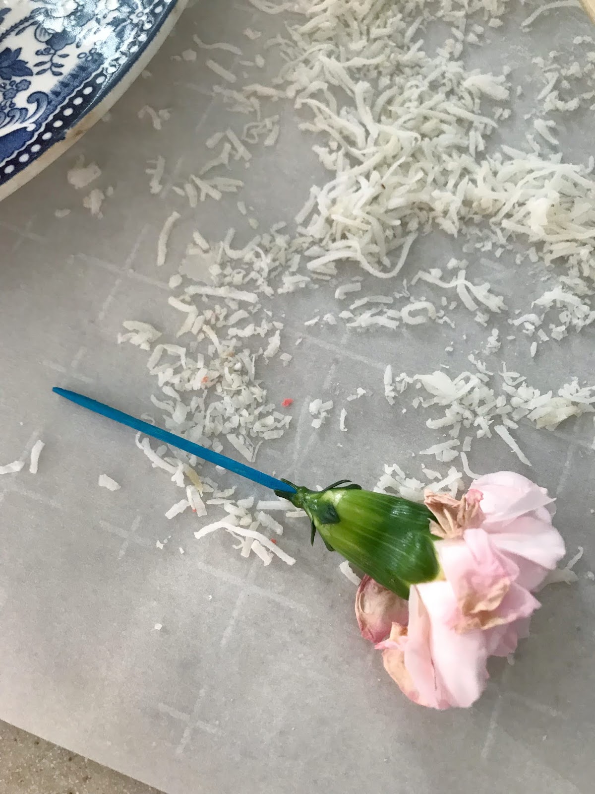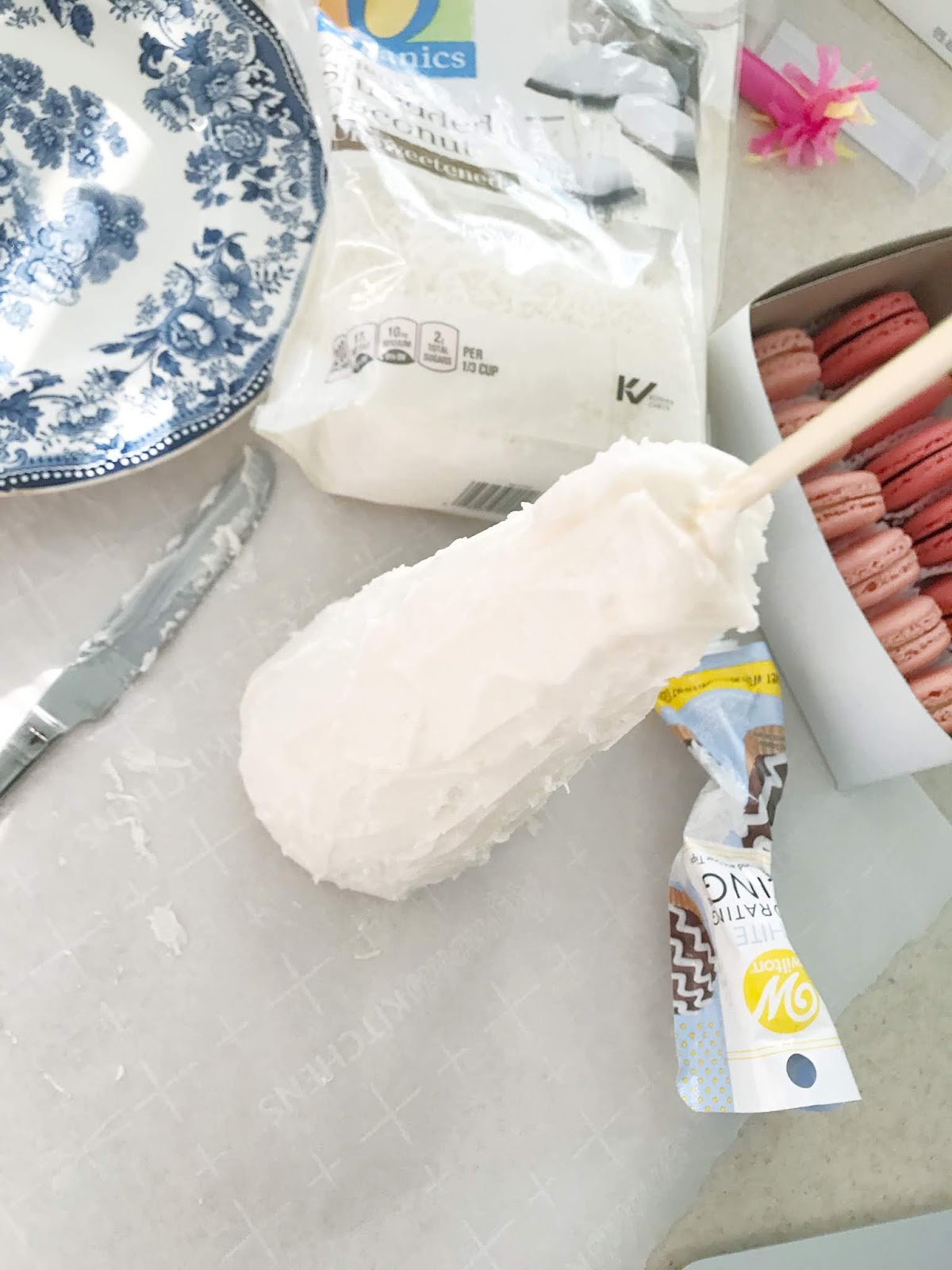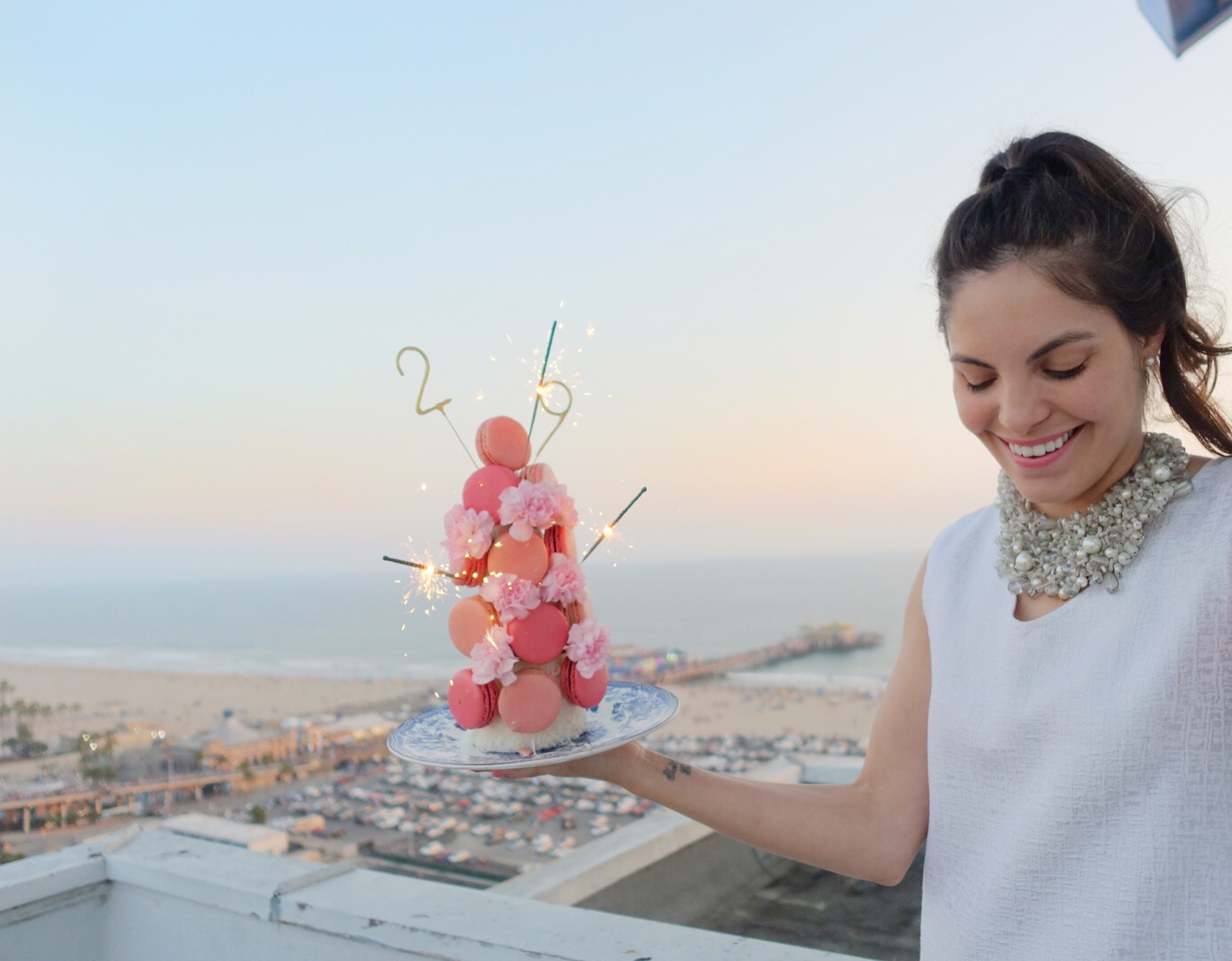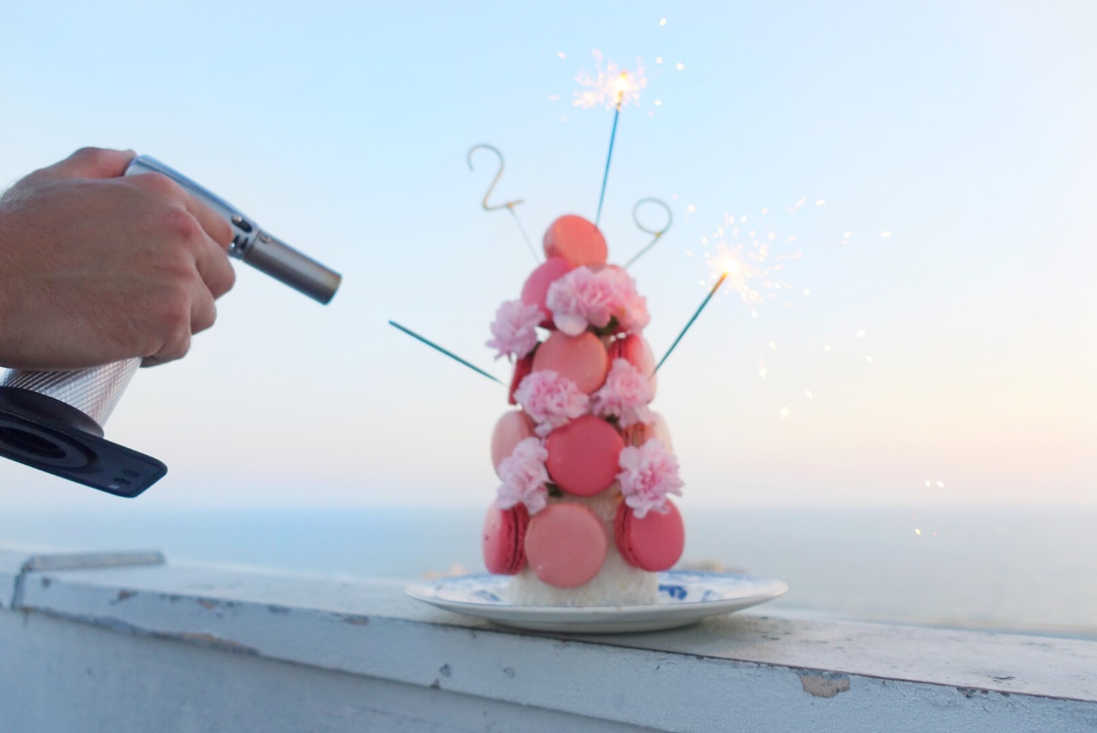 So I decided I’d try my hand at it and it’s fairly simple to do. The only issue I ran into was keeping the macarons in line. They are quite delicate to work with so you need to be really careful using them and making sure they aren’t too soft. The only thing I did differently from this recipe, was I started from the top instead of the bottom of the tower, so my bottom edge didn’t look as smooth as it could have. If you’re planning to recreate this, I highly recommend following the instructions and starting from the bottom. To account for some of the macarons being unevenly placed, I added little flowers in the open spaces to cover them and also because it looked so pretty. I used small pink carnations by pinning them in with a toothpick, just like this recipe instructs for the macarons. I’d have some backup macarons, flowers or strawberries to fill in any gaps at the end, like I did with the mini carnations. I’ve also seen some really pretty chocolate covered strawberry towers that would be fun to make too. It’s a perfect little dessert to have at a party because it’s just so pretty. Since it was my birthday I added some fun number sparklers and regular sparklers. I’ve always had difficulty lighting them but it’s a piece cake when Arthur uses his chef’s torch, which he originally bought to make me crème brûlée on one of our first dates. Otherwise, I’d recommend using a long multi-purpose lighter and avoid windy areas as much as possible. The only other thing to note is that macarons can melt so make sure to keep the tower somewhere cool so they don’t slide off! Otherwise, have a fabulous time.Â