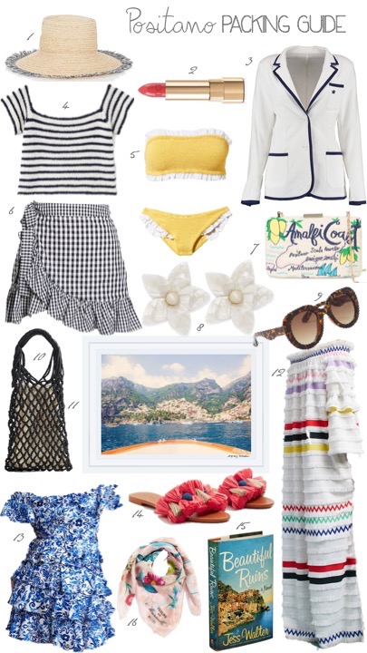 As you can imagine, Positano is a European beach town with visitors from all over Europe and the rest of world and the style there certainly reflects that. Europeans, in my opinion, have a more evolved sense of style and I love seeing how this translates to beachwear as it can be hard to be stylish when it’s 90 degrees outside! On our visit I decided to wear my scarf as a headband with big round sunnies since I knew my hair was likely to get wet. At night I did a chic top knot bun to avoid wasting time on a blow out and it felt very freeing and regal. Also, way cute with the millions of statement earrings I brought to change out every few hours. I also opted for flat sandals the majority of the trip with nothing more than a wedge here and there as Positano is full of steep inclines, pebbled roads and endless stairs! This is NOT a place for heels, let me repeat, no stilettos! If you must have height, I reccomend a very low and chunky heel or reasonably flat wedge shoe, but throw in a pair of flat sandals or flip flops to your basket purse just in case! Like most beach towns, everyone is dressed in something that could easily work with a bathing suit during the day, whether you plan to dive into the Mediterranean or not. Aside from those few things, all the same resort wear outfits will do; loose, embroidered dresses and skirts, tunic coverups, off the shoulder peasant blouses, and woven basket bags.Â