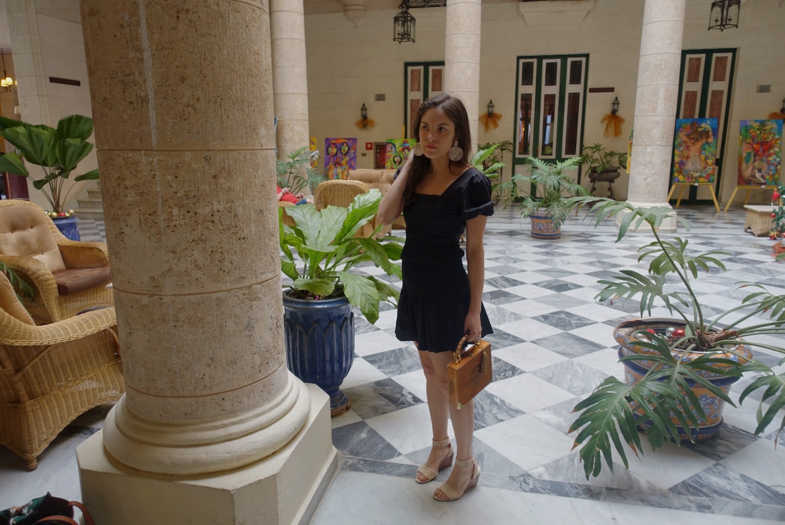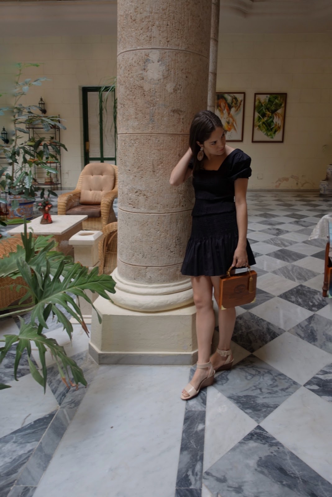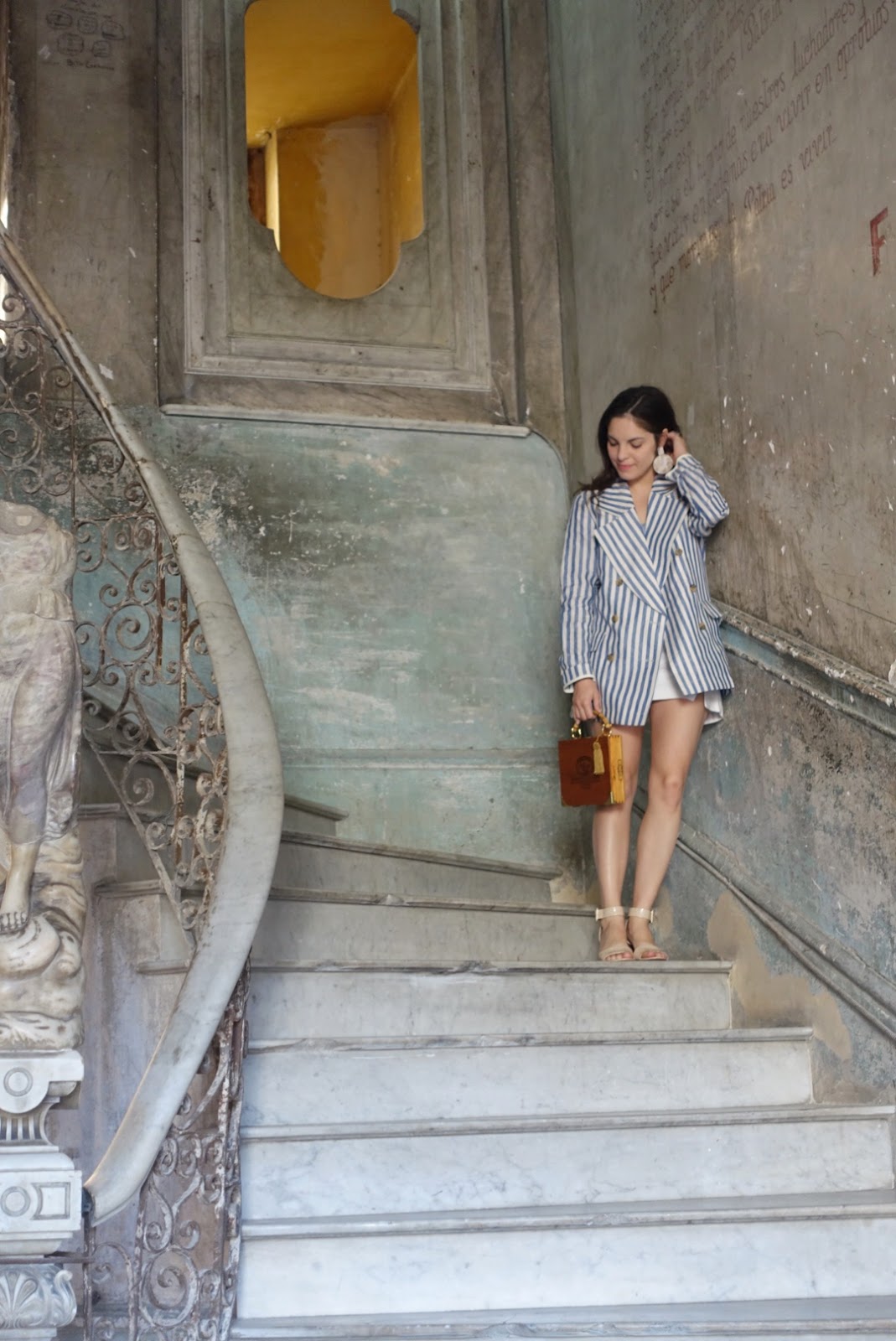 { linen striped blazer | white skirt | heels | cigar purse }