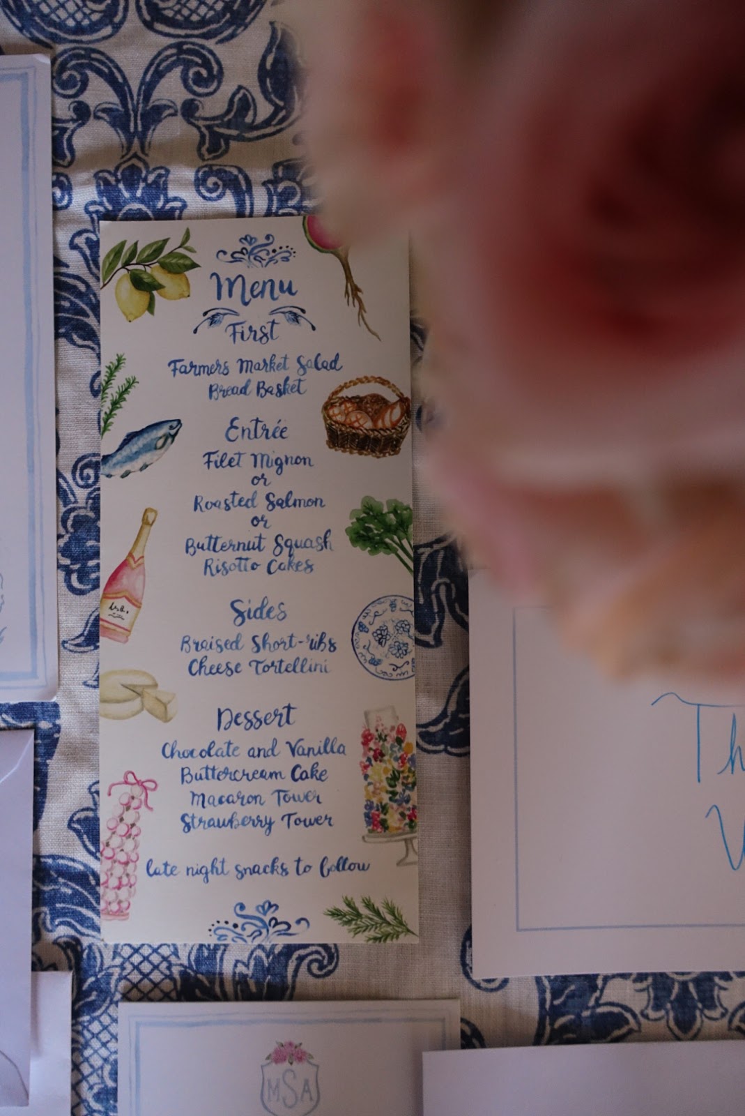 For the menu cards and the signature cocktail menu, I couldn’t get past the idea of a chic little illustration. Fortunately our paper designer was very patient and talented, ultimately bringing to life exactly what we wanted. We loved the detail on each cocktail, especially the genius behind The Pierre, a Frenchie 75! (still patting myself on the back for that one). For our place cards we used these adorable watercolor food stickers to indicate guest’s meal preferences. The food menu was little trickier, but I was able to source some good images to send to our designer. Her recreation of the macaron tower was probably one of my favorite things from the whole wedding, aside from the actual macaron tower of course!Â