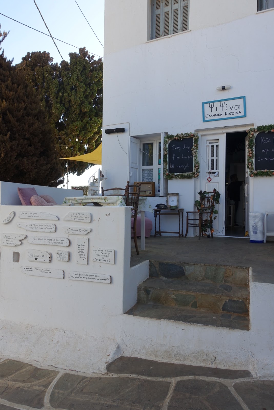 We stumbled into this darling little place for lunch, before our afternoon exploration of Hora on Kythnos island. Kythnos was not originally on our itinerary but fortunately we had wifi strong enough to find this super shabby chic place for a midday snack. I had found the restaurant’s name in English, Psipsína, but when we were walking down a side street from the center to find it, we had some difficulty as none of the sinage was in legible for us.