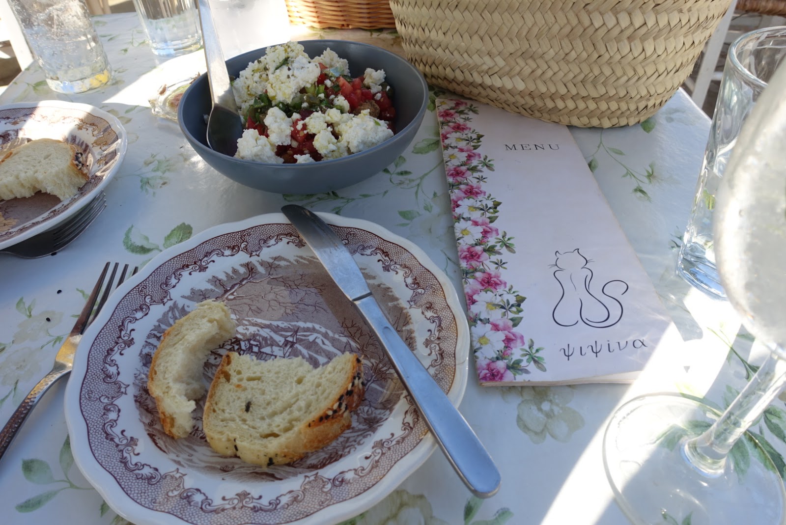 Eventually, the few people working midday confirmed we were at the right place and sat us in a dually shaded and sun drenched spot. We were the only customers, which was not surprising given the tendency for Greek residents and tourists to stay home or at the beach until dinnertime.
