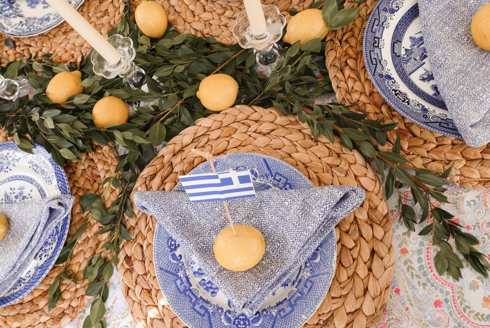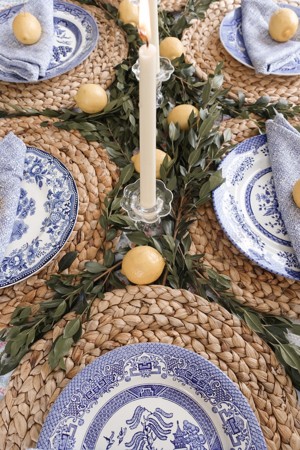 For the rest of the table, I used my beautiful mismatched blue and white plates, natural woven placemats and blue and white linen napkins which all naturally did justice for a summer theme. I found a wonderfully summer colored table linen at Tuesday Morning but linked some similar options you can find online. Last but not least I added my tapered white candles and pretty glass holders from the NYE table I created last December and they added the most simple romantic touch. The easiest way to elevate a table is by adding candles and florals, preferably ones varying in color and size. Overall, it was a truly beautiful start to the many future summer evenings ahead. Have a wonderful first weekend of summer everyone, enjoy!