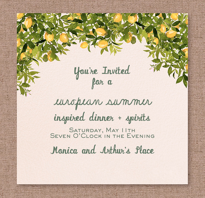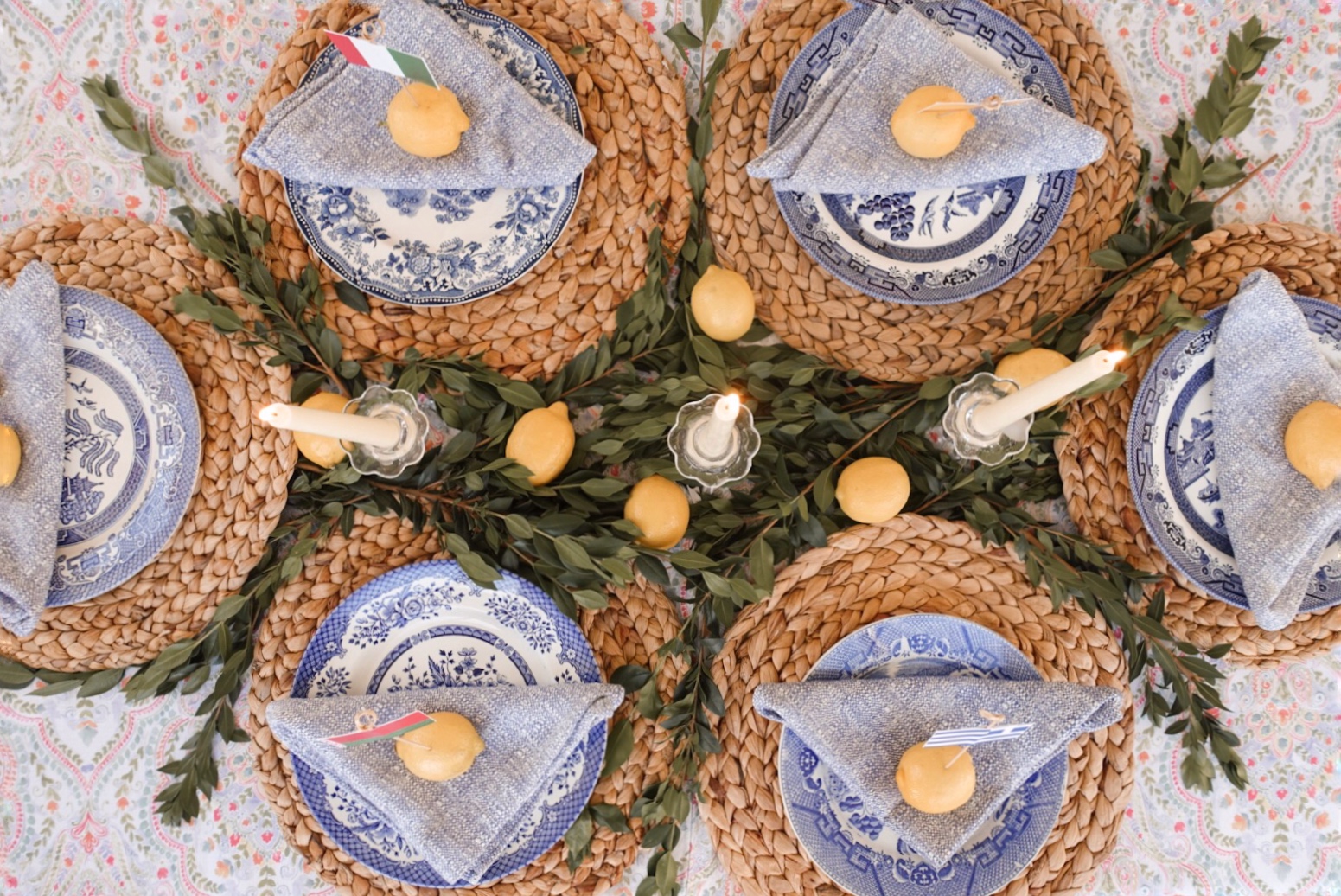 I had a lot of fun setting up this table. I was inspired by the abundance of lemons in Italy and after finding this perfect invitation on Paperless Post, the theme was solidified. I bought about three bags of lemons and spread them all over some green leaf garnish I found in the floral department at Whole Foods. I think I am going to buy a reusable fake version, linked below, since I loved the greenery so much and would love to use it again. I knew I wanted the lemons to serve as place cards too, but instead of inserting paper into the lemon wedge I decided to assign everyone a European country and see if they could guess which one they were and hence, where they were sitting. Spoiler alert, everyone successfully guessed! I printed out mini flags so that I could have the exact six countries I wanted, but there are plenty of mini flags available online. The leftover lemons went towards my floral arrangements and looked really pretty sliced up against the vase.