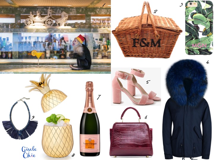1. Five o’ Clock Print by Gray Malin 2. Fortnum & Mason Hamper 3. The Beverly Hills Hotel Martinique Wallper iPhone 6 Case 4. Navy Raccoon Fur Collar Parka 5. Pink Velvet Heels 6. Faux Crocodile Burgundy Bag 7. Veuve Clicquot Rosé 8. Golden Pineapple Tumbler 9. Navy Fringe Necklace