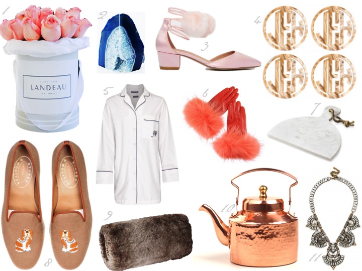 1. Landeau Rosé Bouquet 2. Blue Agate Bookends 3. Pink Pom Pom Pointed Heels 4. Acrylic Monogram Coaster Set 5. Monogramed Boyfriend Sleepshirt 6. Leather Gloves w/fur Trim 7. Marble Cheese Board 8. Stubbs and Wootten Slippers 9. Faux Fur Muff 10. Copper Teakettle 11. Olivia Palermo for Bauble Bar Bib Necklace