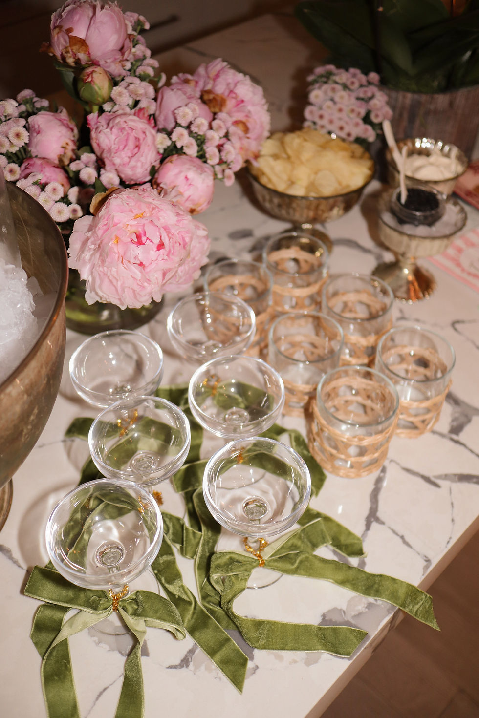 Towers are definitely more useful for a table displaying hors d’oeuvres and cocktails as they make a nice backdrop. But I wanted to accomplish both which meant removing the flowers and placemats later for my table for six.
